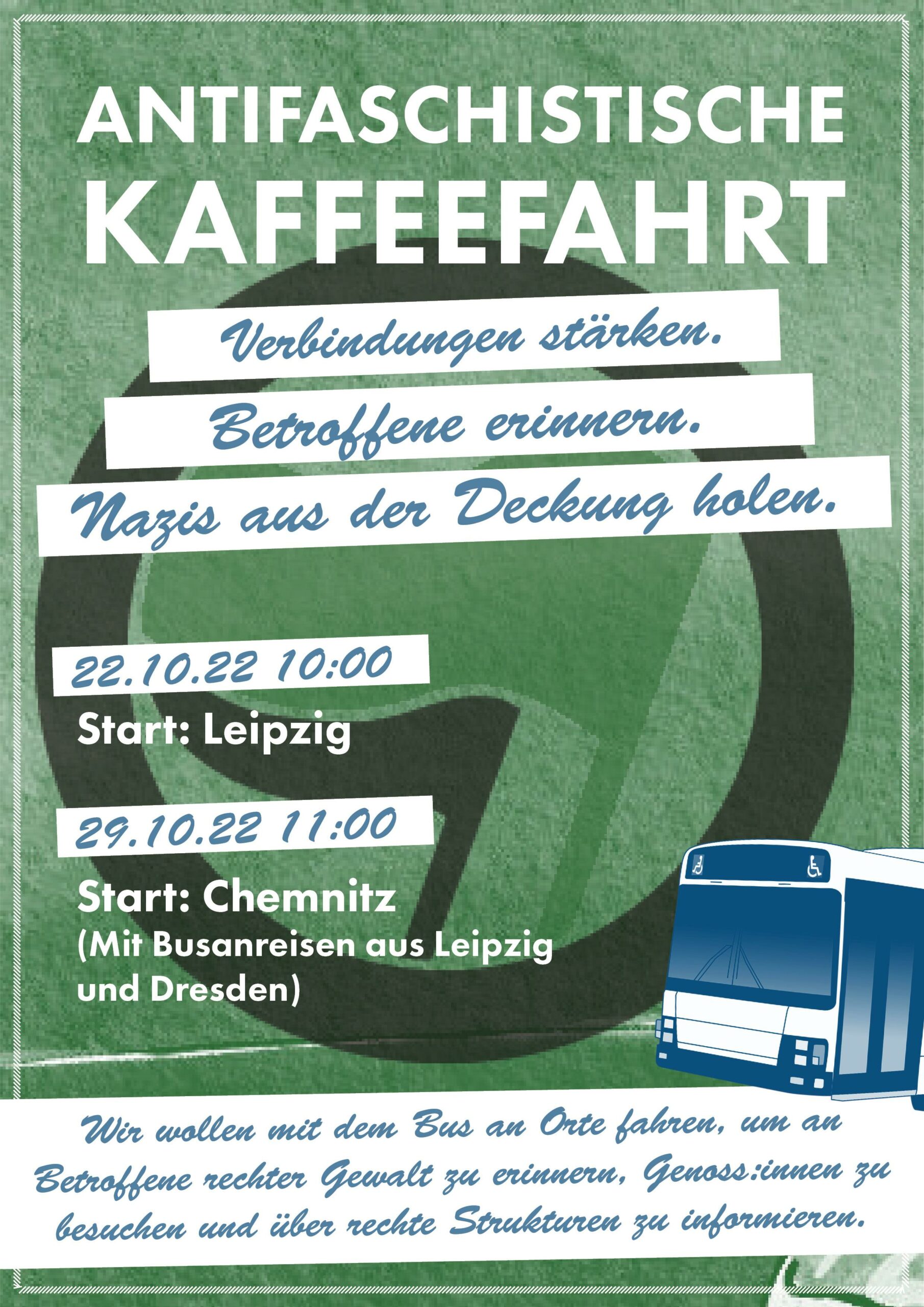 an den letzten beiden Oktober Wochenenden veranstalten wir zwei antifaschistische Kaffeefahrten. Am 22.10.2022 (Start 10:00) soll es an verschiedene Orte im Raum Leipzig gehen. Der Fokus liegt dabei auf Netzwerken der extremen Rechten über die wir informieren werden, um Akteur*innen aus der Deckung zu holen und ein Zeichen antifaschistischer Praxis zu setzen. Eine Woche später, am 29.10.2022 (Start 11:00) werden wir im Raum Chemnitz unterwegs sein. Hier soll es besonders um eine Stärkung der Verbindungen zu unseren Genoss*innen in den umliegenden lokalen antifaschistischen Strukturen gehen. Dafür wollen wir in einen Austausch untereinander kommen und auch hier gemeinsam an relevante Lokalitäten der rechten Szene vor Ort fahren. Für die Chemnitz-Tour am 29.10.2022 ist es möglich bereits in Leipzig und Dresden in die Busse zuzusteigen (Start 9:30).