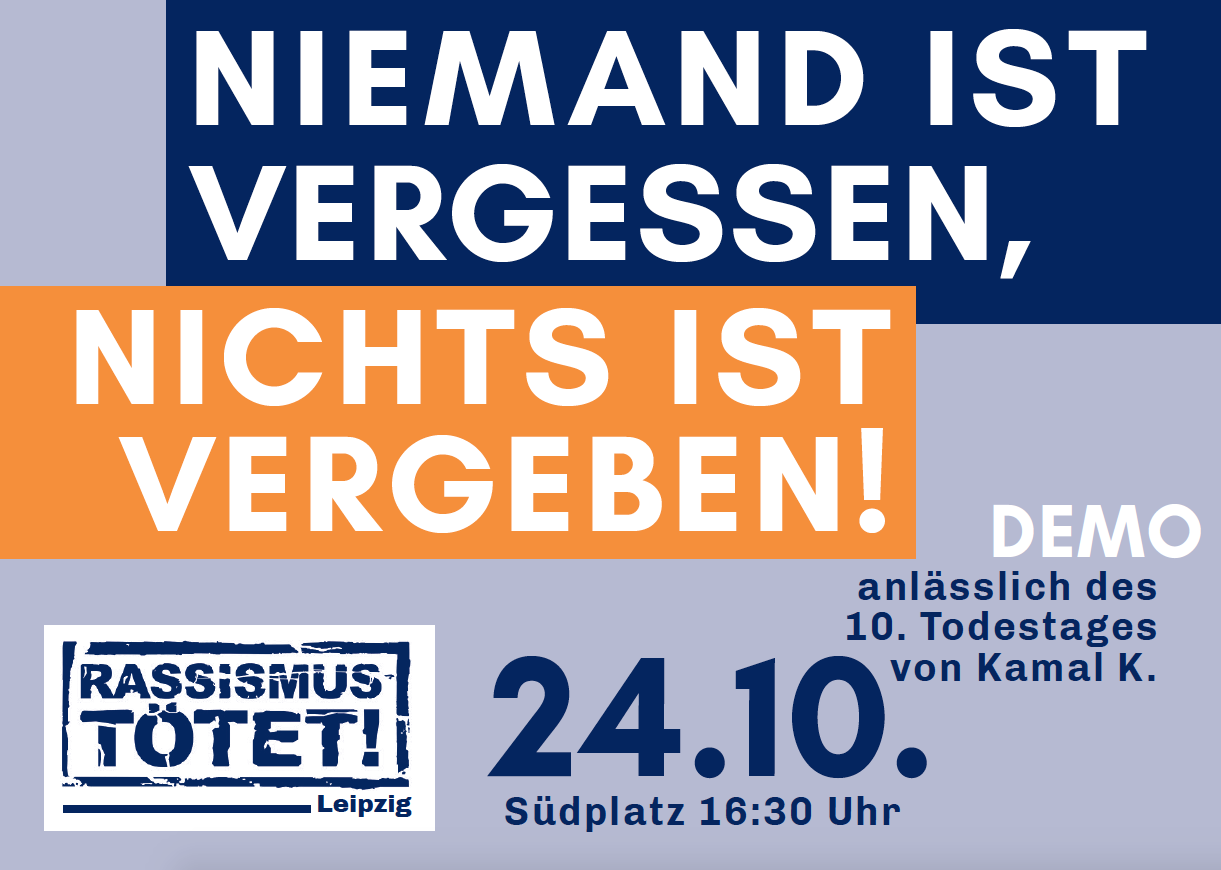 All das ist jetzt nun 10 Jahre her. In diesen 10 Jahren ist viel dafür getan worden, dass die rechte Ideologie der Täter nicht mehr geleugnet wird und dass der Mord nicht in Vergessenheit gerät. Und so liegt es auch in diesem Jahr nicht beim Staat, sondern bei aktiven Antifaschist*innen, das Gedenken an Kamal K. und allen weiteren Todesopfern rechter Gewalt in Leipzig und Deutschland lebendig zu halten.