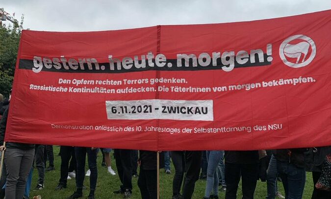 Und immer wieder geht es um Sachsen. In Zwickau konnte der NSU jahrelang unbehelligt und bestens integriert wohnen und das Morden planen und umsetzen. Dennoch verwehrt sich die Stadt bis heute gegen eine konsequente Aufklärung der Taten und die Aufarbeitung der Rolle der Stadt in Bezug auf den NSU. Dabei wohnen Personen aus dem Unterstützer*innen-Netzwerk, wie beispielsweise André Eminger, noch heute in Zwickau und Umgebung. Abseits von kleinen Aktivist*innengruppen findet Gedenkarbeit in Zwickau nicht statt. Gerade in Zwickau waren Antifaschist*innen in den letzten Jahren von einer massiven Gewalt und Bedrohungslage durch rechte Strukturen ausgesetzt.