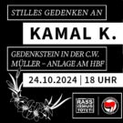 Stilles Gedenken Kamal Kilade am 24.10.2024 um 18 Uhr am Gedenkstein in der C.W. Müller – Anlage am Leipziger Hauptbahnhof. Bringt gerne bitte Kerzen und Blumen mit.